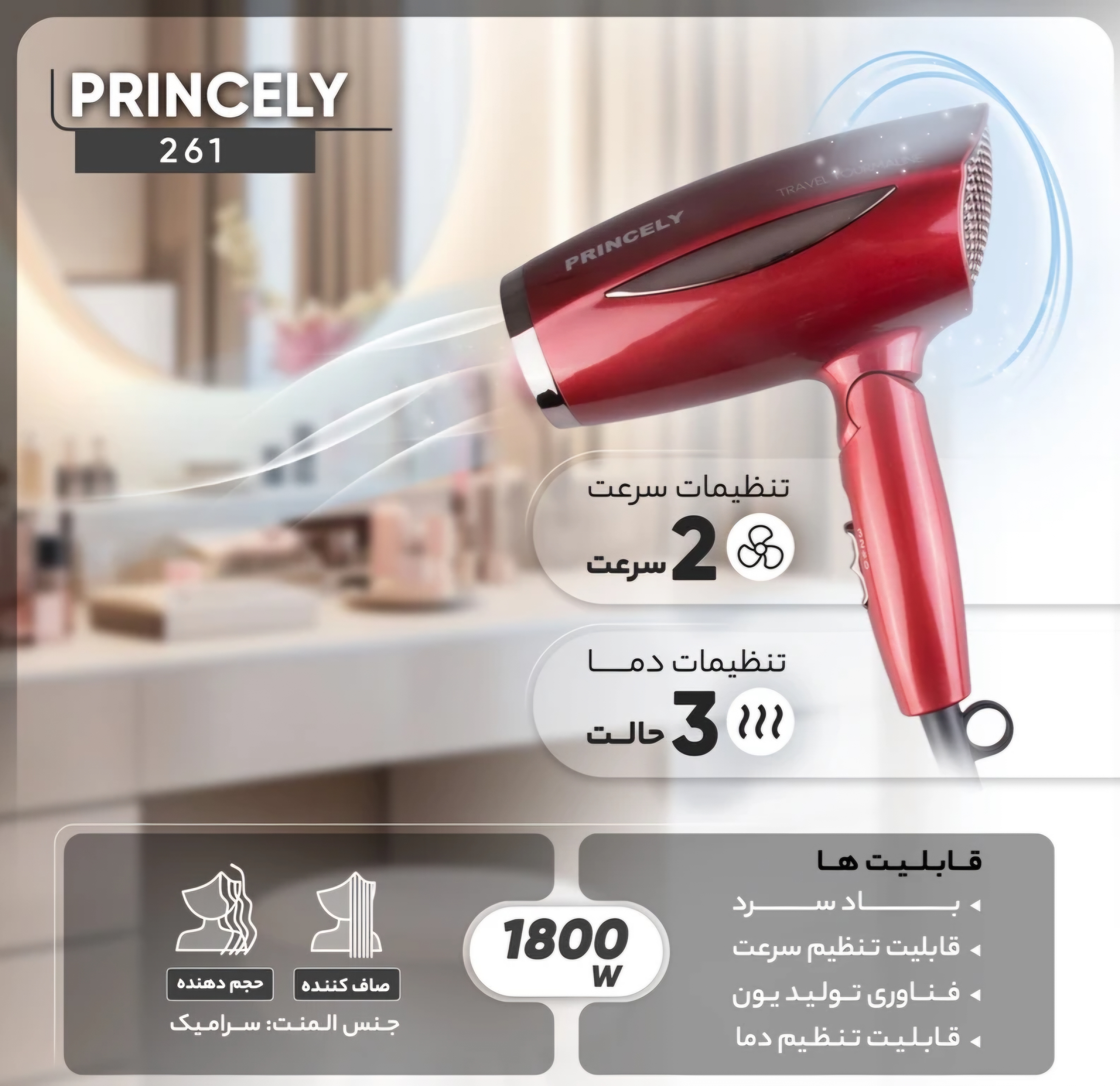سشوار مسافرتی و تاشو پرنسلی مدل PR261، بهترین همراه شما در سفرها! با طراحی ارگونومیک و توان بالا، موهای شما همیشه درخشان و مرتب خواهد بود. این سشوار سبک و کمحجم به راحتی در چمدان جایی میگیرد و به سرعت موهایتان را خشک و براق میکند. انتخاب حرفهای برای تمام سفرهایتان!