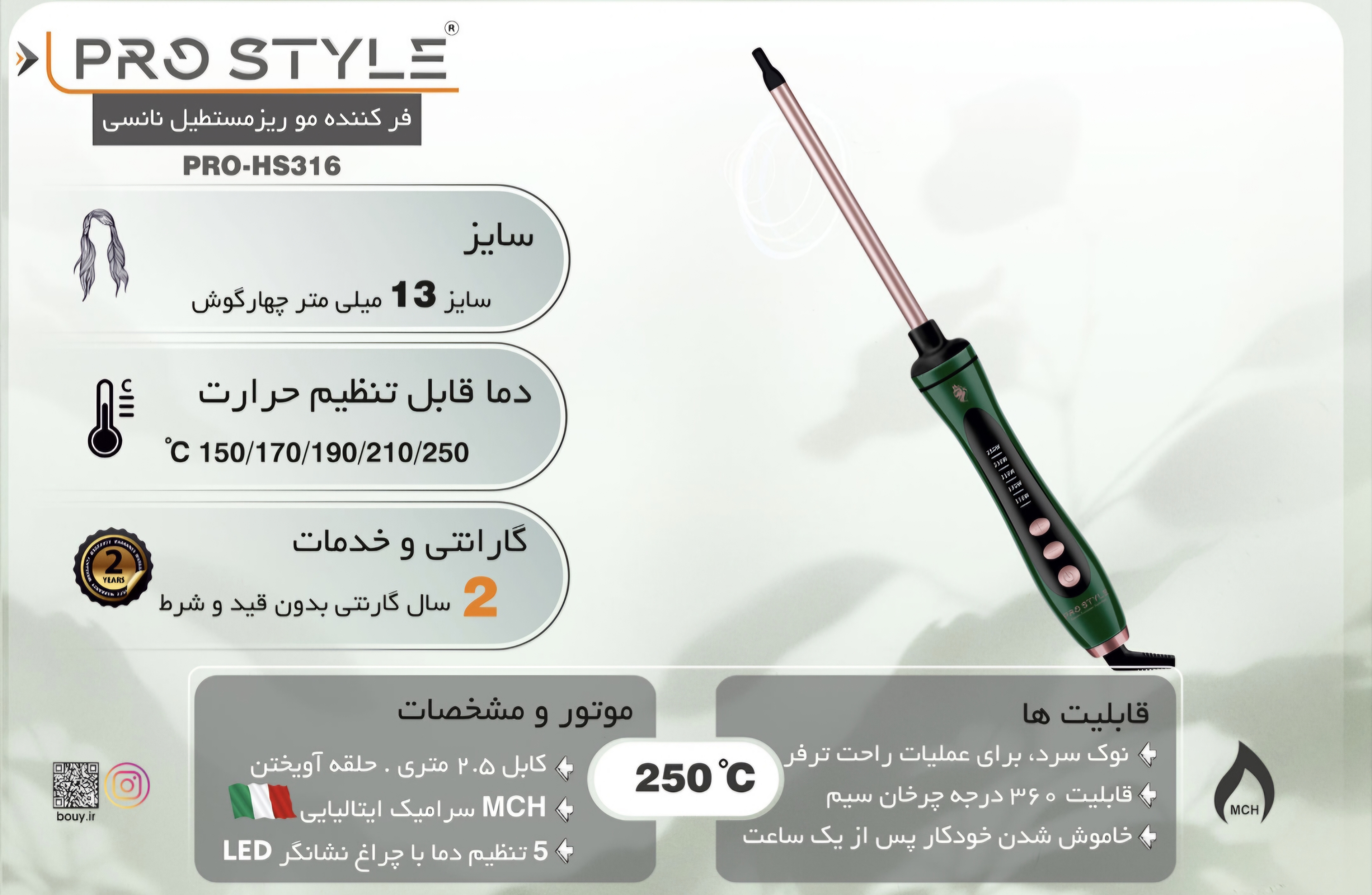 گیره نگهدارنده دستگاه با دقت بالایی طراحی شده تا موها را بدون ایجاد رد یا خط روی ساقه، به خوبی مهار کند. کابل برق این مدل با قابلیت چرخش ۳۶۰ درجه و طول استاندارد سالنی، محدودیت حرکتی را به طور کامل از بین میبرد. اگر به دنبال دستگاهی هستید که ظریفترین فرهای ممکن را با کیفیت ساخت فوقالعاده و دوام بالا ایجاد کند، مدل PRO-S316 نانسی پرو استایل استاندارد جدید شما خواهد بود.