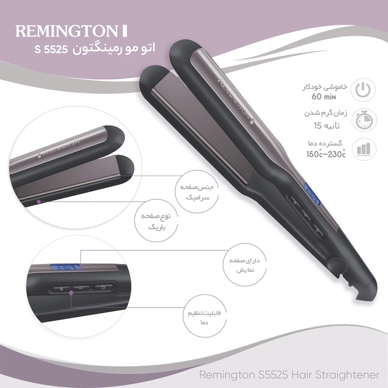 اتو مو رمینگتون مدل S5525 | اتو مو پهن حرفهای با صفحات سرامیکی و تنظیم دما تا ۲۳۰ درجه. صافکننده سریع و یکنواخت موها، مناسب موهای ضخیم و نازک. همین حالا خرید کنید!