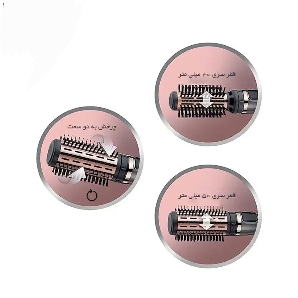 این دستگاه با دو سری برس چرخشی قابل تعویض (قطر 40 و 50 میلیمتر) عرضه میشود تا بتوانید بسته به نوع مو و مدل دلخواه، از آن برای حجمدهی، صاف کردن یا حالت دادن استفاده کنید.