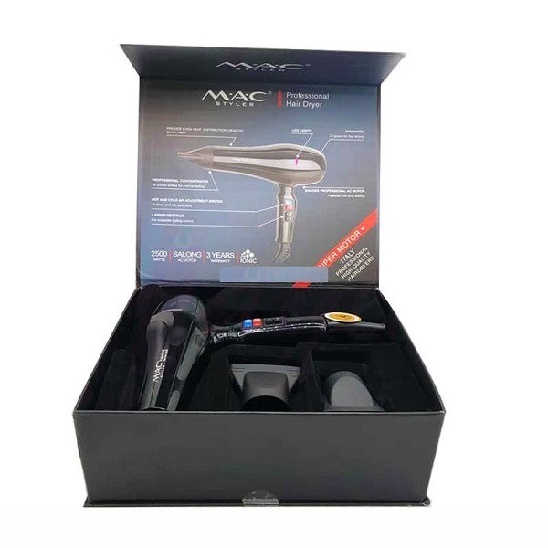 سشوار مک استایلر مدل MC-6688 با توان 2500 وات و موتور قدرتمند AC، انتخابی ایدهآل برای خشک کردن سریع و حالتدهی حرفهای موهاست. دارای 2 سرعت باد، 3 حالت حرارت و دکمه باد سرد. محصول اورجینال از مُدا گالری