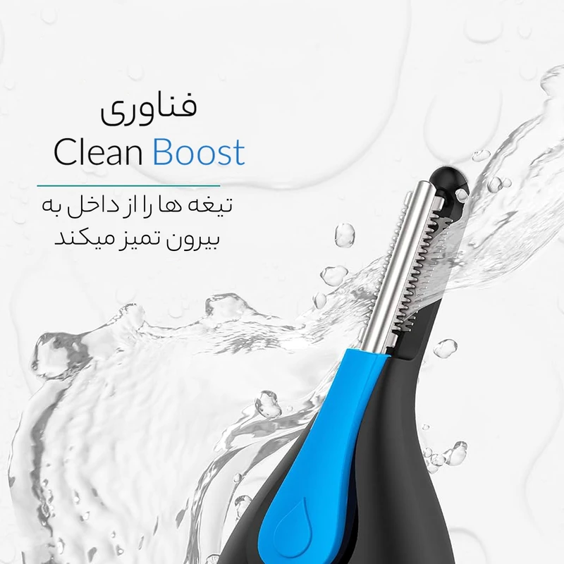 2. تیغههای Comfort Tip (نوک راحت): لبههای تیغه با طراحی گرد و ایمن، هرگونه خطر خراش یا کشیدگی در نواحی حساس بینی و گوش را کاملاً برطرف میسازند.