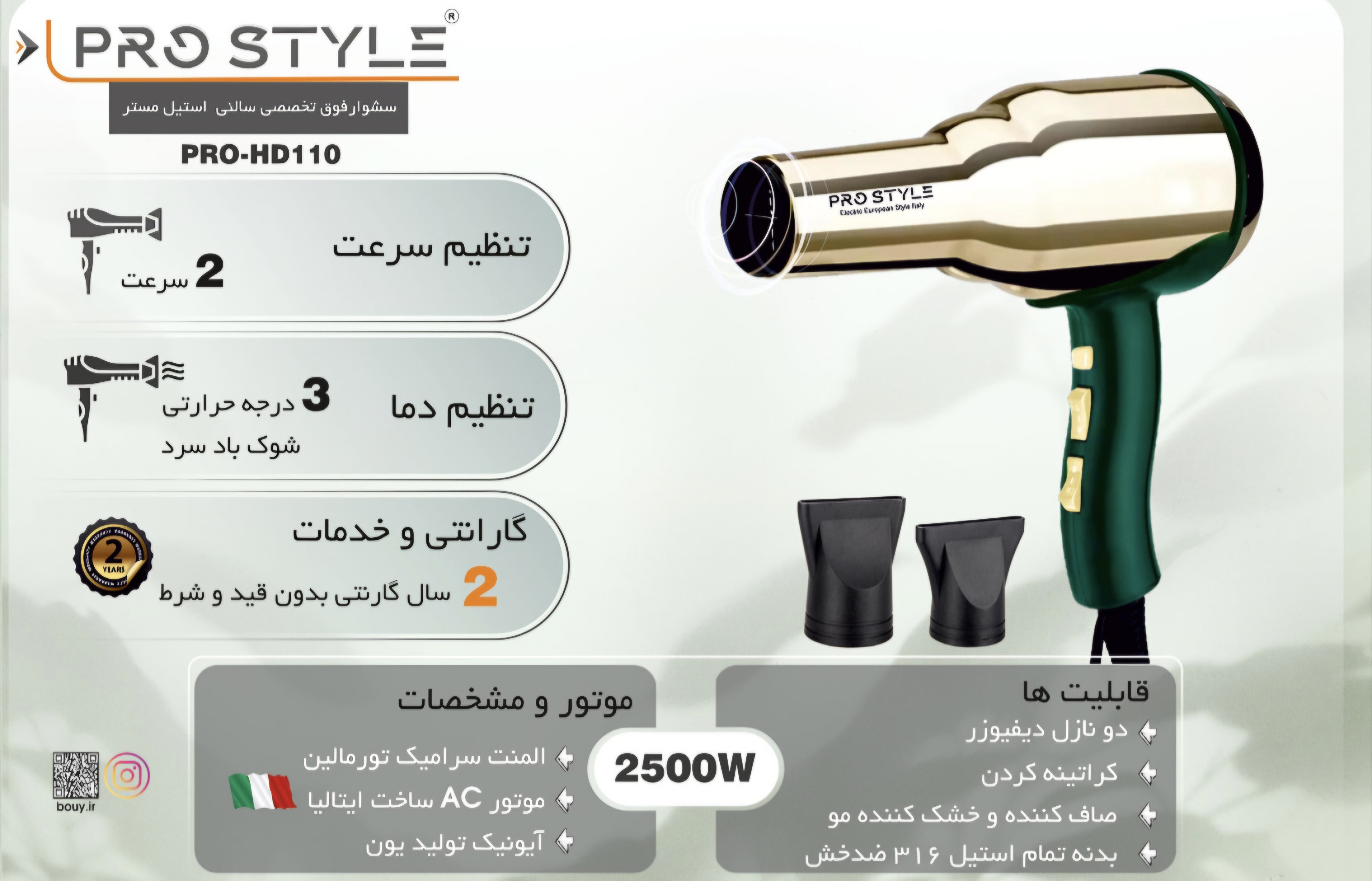 سشوار ۲۴۰۰ وات پرنسلی PR249: قدرت موتور AC برای استایلینگ بینقص ، مهندسی ایتالیایی، خشککردن سریع، تضمین ماندگاری و درخشش مو
